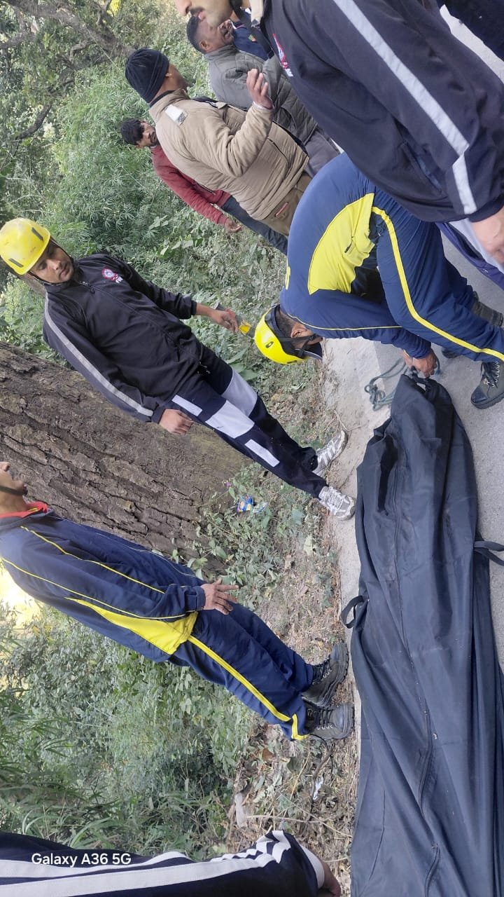 SDRF टीम द्वारा गहरी खाई में उतरकर दुर्घटनाग्रस्त वाहन तक पहुँच बनाते हुए रोप स्ट्रेचर की सहायता से उक्त व्यक्ति के शव को खाई से बाहर निकाला व जिला पुलिस के सुपर्द किया गया।