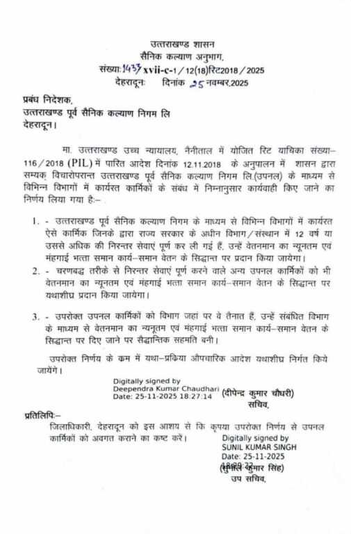 उत्तराखंड सरकार ने उत्तराखंड पूर्व सैनिक कल्याण निगम लिमिटेड (UPNL) के कर्मचारियों के लिए एक बड़ा फैसला लिया है। सरकार ने 12 साल से अधिक समय से काम कर रहे…