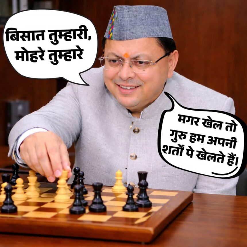 राजनीति की बिसात में पुष्कर को खत्म विपक्ष ( ये बात अलग कि विपक्ष को कैसे मित्र बनाकर जेब ने रखना है और कब अमित शाह की तरह विपक्ष को जेब में डालना है ) की जगह अपनी ही पार्टी के खुंदकी लोगों की शतरंजी चालों को ज्यादा झेलना पड़ता है । और वो खुंदकी बार बार हारने के बाद भी पुष्कर की गहराई नहीं पा पाते । जब वो हवा उड़ाते है कि देखिए प्रधानमंत्री उत्तराखंड के हर नेता से मिल रहे और पुष्कर को टाइम नहीं दे रहे तो पुष्कर 3 महीने में 3बार प्रधानमंत्री से मिलने वाले पहले भाजपाई मुख्यमंत्री होते हैं । जब हवा अंदरूनी काले ढोंगी उड़वाते है कि अमित शाह जी पुष्कर से बहुत नाराज़ हैं तभी अमित शाह सरकार की उपलब्धियां गिनाने चुनावी बिगुल फूंकने पुष्कर की उपलब्धियों के साथ आ जाते हैं । जब हवा उड़ती है कि पूरा मंत्रिमंडल मुख्यमंत्री समेत ही बदला जाएगा तब हवा निकल कर पंचर साइकिल ही विरोधियों को खींचनी पड़ती है । जब सारे कयास भाग दौड़ को अफवाहों का जामा पहनाया जाता है तब पुष्कर मुस्कुराता है और जब कहा जाता है कि अब बस ऐसे ही कर जाएगा साल तो बिना सुन्न पटाक पुष्कर कर देता है कमाल और चुपचाप हो जाता है मंत्रिमंडल विस्तार ।